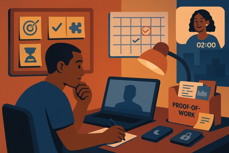 Possible artifacts include a one-paragraph explanation, a set of flashcards, a screenshot of a solved problem, a tiny script that runs, or a 60-second audio summary. The rule is one artifact per block. By week three you have a folder full of proof. By week six you have a portfolio.